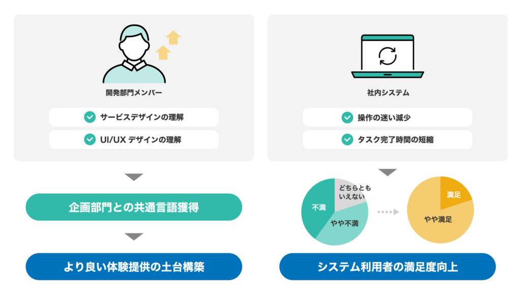 本プロジェクトを通じ、メンバーのサービスデザインおよびUI/UX理解度向上と、既存システムのUI/UX改善の両取り組みが成果を上げ、業務スキル向上と利用者満足度改善に繋がりました。