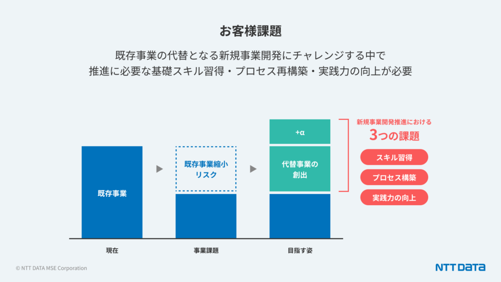 電力関連事業を基幹事業とするお客様企業は、カーボンニュートラルへの対応により、既存事業の縮小のリスクが顕在化していました。従来から新規事業開発にチャレンジされていましたが、