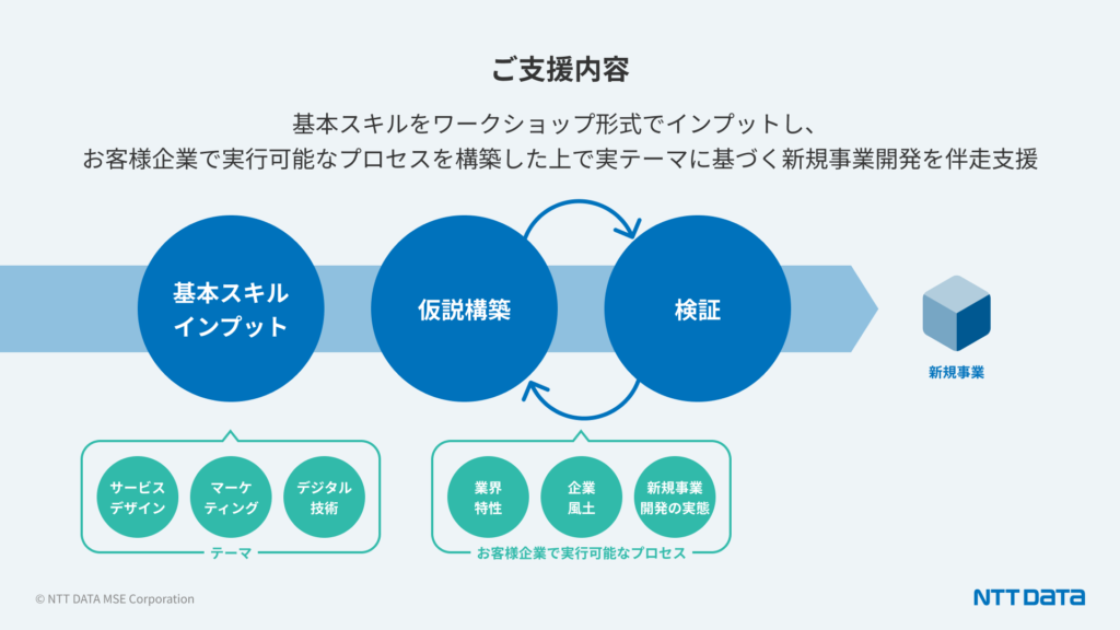 これらの基盤を構築した上でお客様内の実行メンバが実践力を養うために、お客様が取り組む新規事業のテーマに基づき、新規事業開発の実行をサポートする伴走支援を実施、新規事業のスモールスタートまで実現しました。