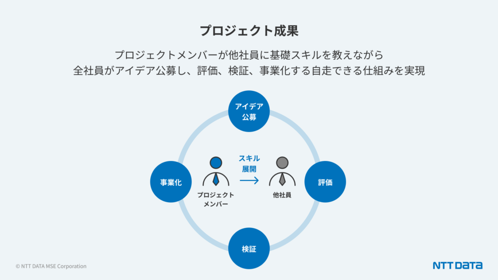 新規事業開発の基本スキルの習得について、本プロジェクトの参加メンバーが新規事業のアイデアを公募する他の社員に対して、社内講師としてスキルの展開ができるレベルまで習熟することができました。