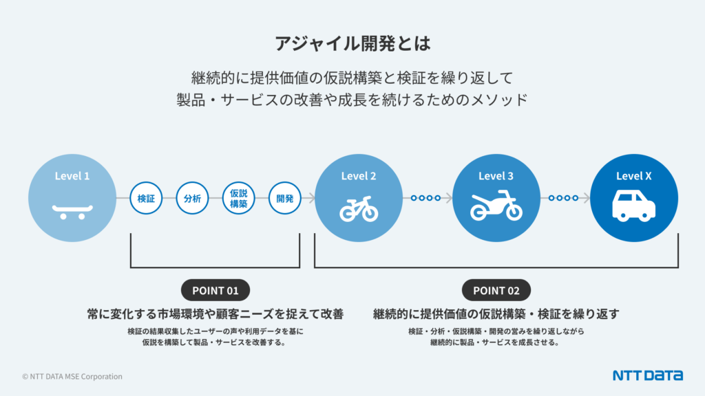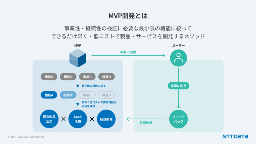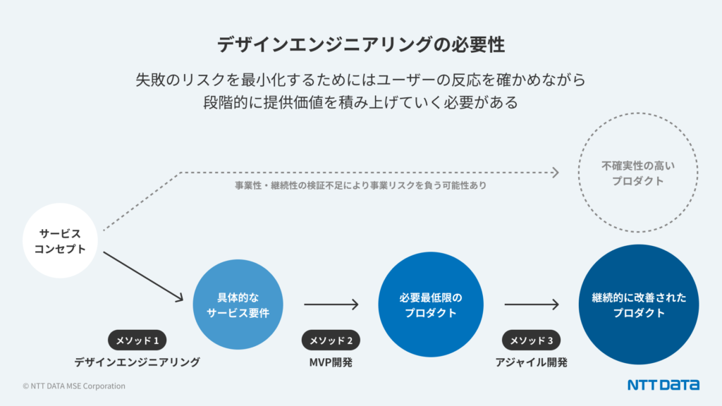 また、新規事業アイデアの有用性が検証されたとしてもその事業性や継続性までは検証しきれていない状況で大きな投資を行い、完成形のプロダクトを当初から開発することは大きな事業リスクを負うことになります。変化が早く不確実な現在、必要最低限のプロダクトを素早く・低コストで開発し、ユーザの反応を確かめながら段階的に提供価値を積み上げて行く必要があります。