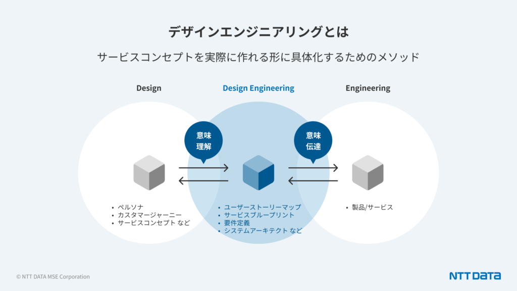 デザインエンジニアリングは、サービスデザインで生み出されたサービスコンセプトを、実際に作れる形に具体化するためのメソッドです。ペルソナやカスタマージャーニー、サービスコンセプトなどの抽象的なアウトプットから具体的なプロダクト・サービス開発を行う際、しばしば認識のズレが生じがちです。