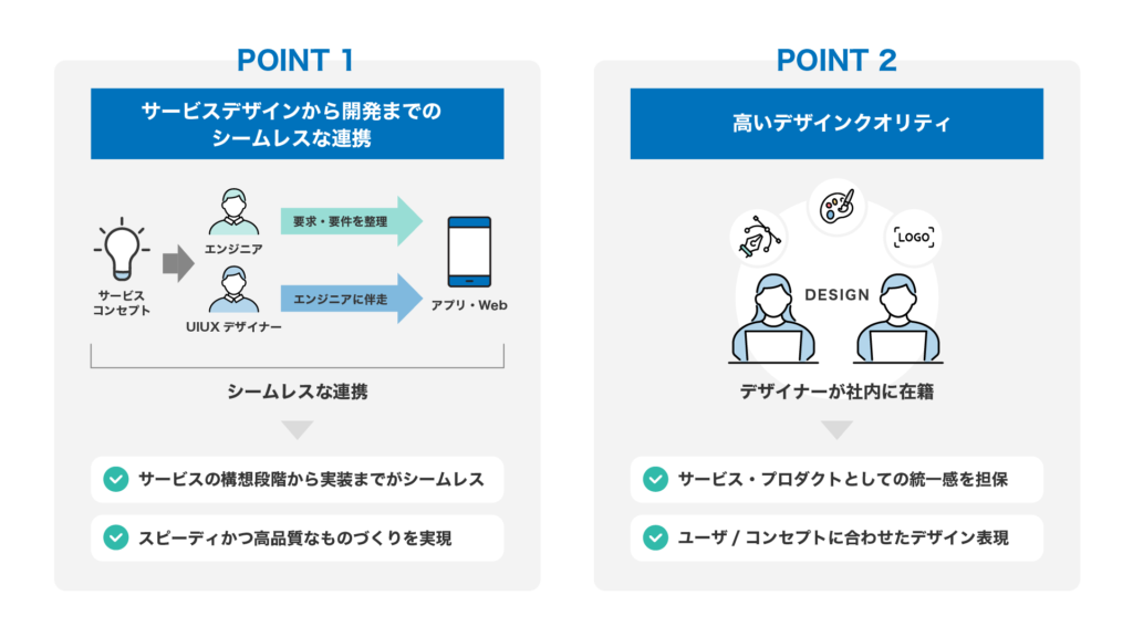 また、サービスをリリースして終わりになっているケースも多く見られますが、ユーザの利用状況や感情を調査し、改善を重ねることで、サービスは継続的に成長していきます。そのため、この改善まで含めた支援が重要となります。