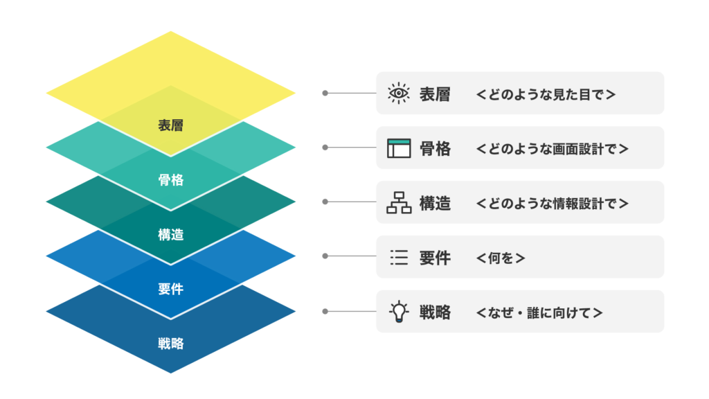 UIUXデザインは、Jesse James Garrettが提唱した「UXの5階層モデル」をもとに実施しています。