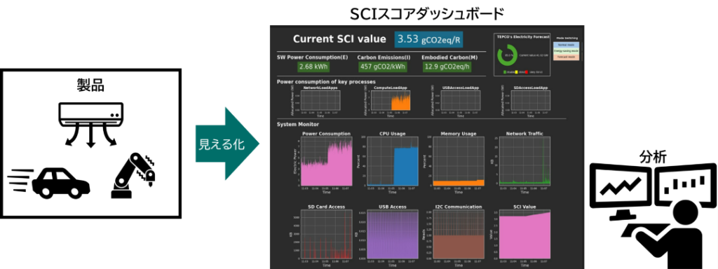 ほかにもNTTデータMSEは「グリーンソフトウェア開発支援サービス」を通じて、企業のグリーンソフトウェア実現を支援しています。同社独自の「SCIスコアダッシュボード」を用いることで、製品のソフトウェアの動作状態とSCIを関連付けて見える化し、炭素排出に大きく影響している箇所を特定します。これにより、エネルギー効率、カーボンアウェアネス、ハードウェア効率など総合的な観点から最適な改善策を提案し、ソフトウェアの環境負荷を最小限に抑えることが可能になります。