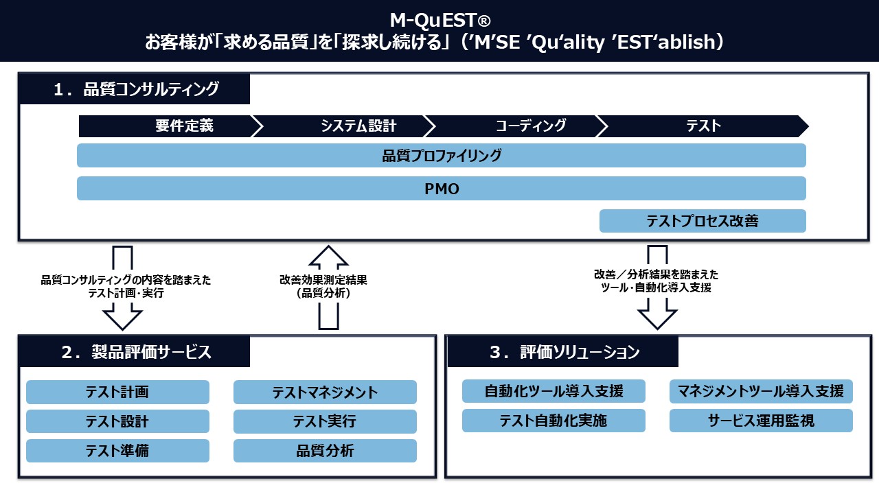M-QuEST®は、以下の3つのサービスを通じて、お客様のソフトウェア品質を向上させます。