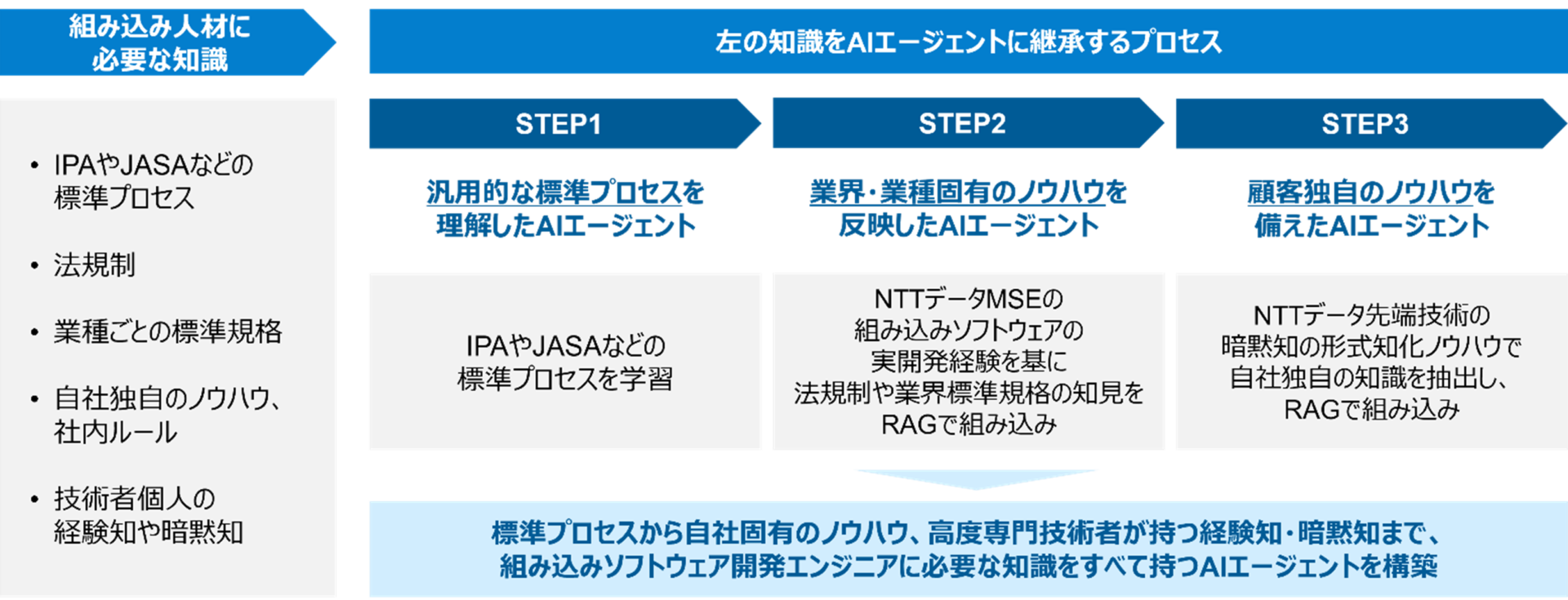こうした背景を踏まえ、組み込みソフトウェア開発において現場で培った知見を有するNTTデータMSEと、最新の生成AI領域における技術的知見と暗黙知の形式知化ノウハウを持つNTTデータ先端技術の強みを組み合わせ、AIエージェントを活用した課題解決を支援することとしました。